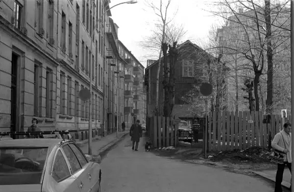 gateløp, Arbeidskollektivet Hjelms gate 3, port, skilt, gjerde, trehus, bygårder, boligblokk, biler, mennesker