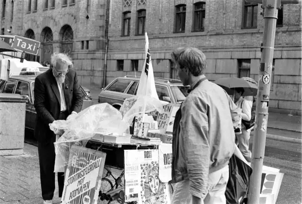 plass, mann, politisk aktivist, vogn med informasjonsmateriell, plakater og jakkemerker for politiske saker og humanitære formål, Stortingsbygningen, drosjeholdeplass