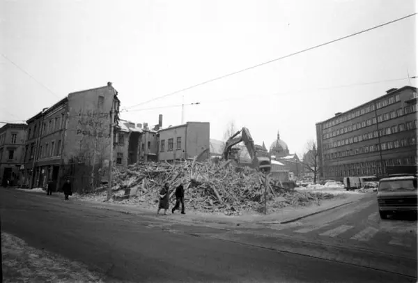 gateløp, biler, mennesker, bygårder, rivningsarbeid, gravemaskin, kontorbygning
