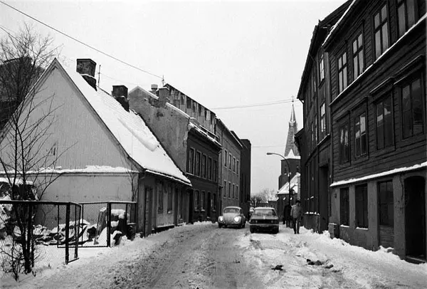 gateløp, trehusbebyggelse, bygårder, biler, snø