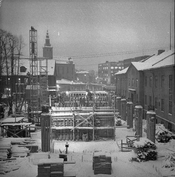 Empirekvartalet, byggetomt for regjeringshøyblokken, Militærhospitalet, Rikshospitalet, Hovedbrannstasjonen, kontorbygning, Margaretakyrkan, bygård, snø