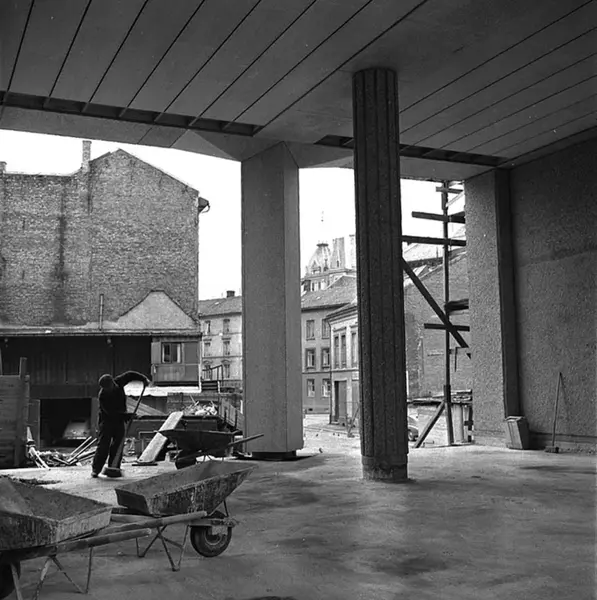 kontorbygning, byggevirksomhet, passasje, mann, trillebårer, bygårder, gavlvegg