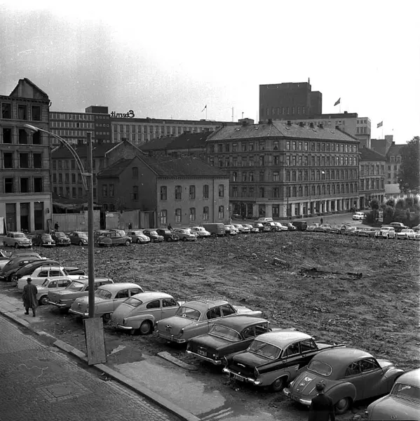 rivningstomt, parkeringsplass, biler, bygårder,kontorbygninger, Rådhuset