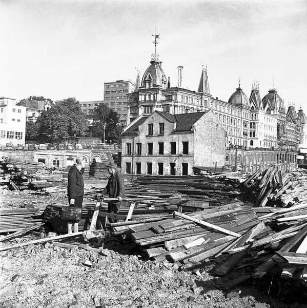 rivningstomt, menn, plankestabler, bygård, Ruseløkka skole, Ruseløkkbasarene, Ingeniørenes Hus, villa, Victoria terrasse
