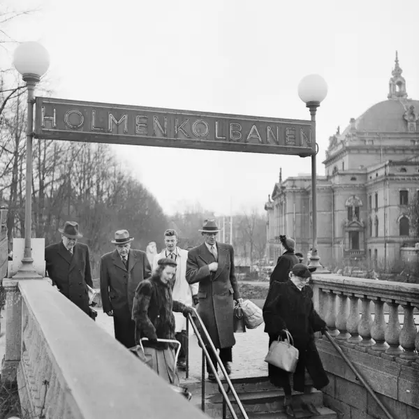 nedgang til Nationaltheatret stasjon, mennesker, skilt: Holmenkolbanen, Nationaltheatret