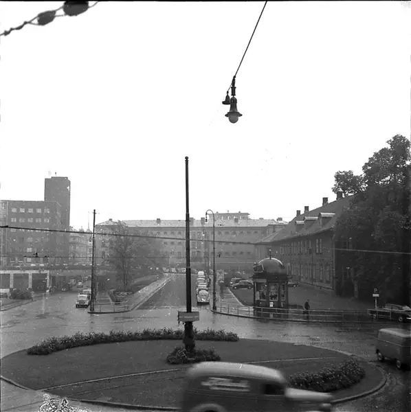 gatekryss, rundkjøring, biler, kiosk, Militærhospitalet, Møllergata 19 fengselsbygning, Hovedbrannstasjonen, gatebelysning, trikkeskinner