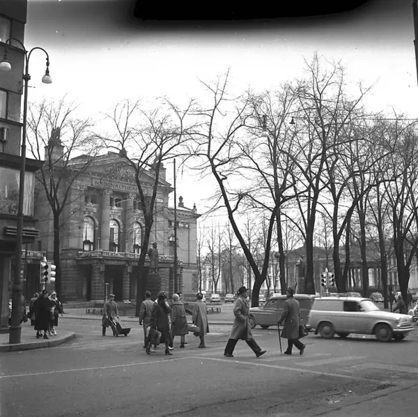 gatekryss, fotgjengerovergang, mennesker, trafikklys, biler, portrettstatuer, Nationaltheatret, musikkpaviljong, Universitetet, hjørnet av Høyres Hus