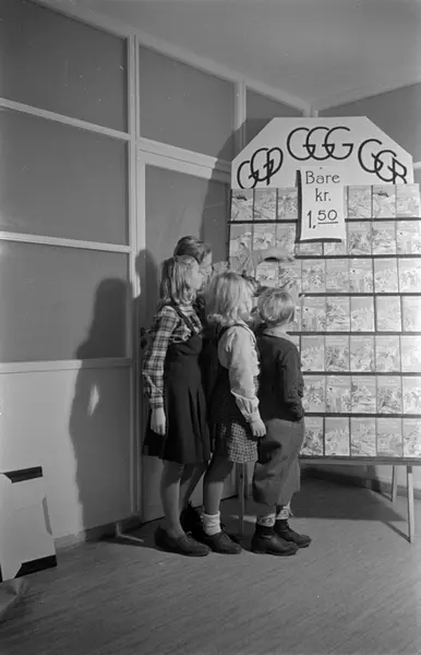 reklameplakat for Gyldendals Gode Guttebøker (GGG), Gyldendals Gode Pikebøker (GGP), Gyldendals Gode Barnebøker (GGB), gutter, jenter