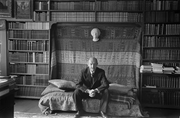 mann, forfatter, sittende helfigur, interiør, divan, veggteppe, bokhyller