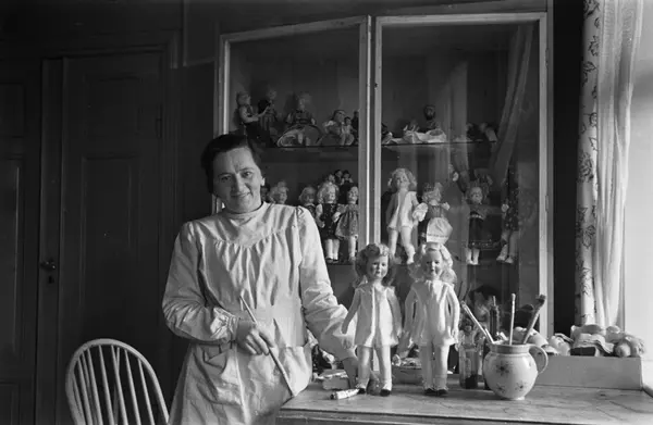 Rønnaug Petterssens dukkefabrikk, interiør, kvinne, dukkemaker, dukker