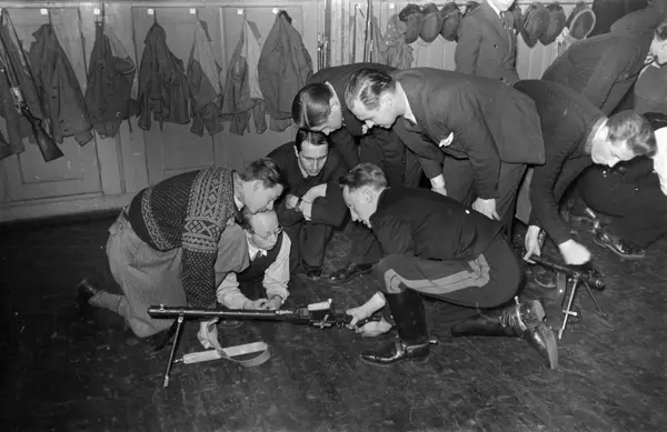 Hegdehaugen skole, interiør, gymnastikksal, menn, studenter, våpen, frivillig militæropplæring