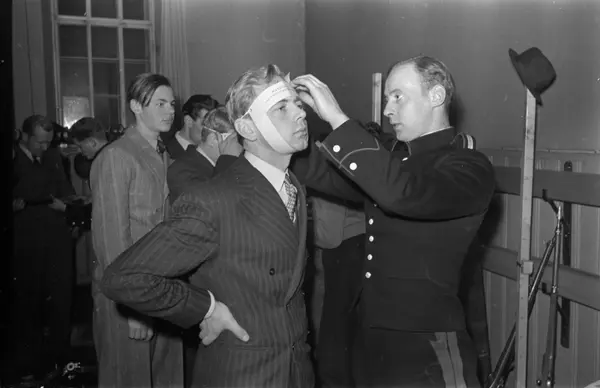 Hegdehaugen skole, interiør, gymnastikksal, menn, studenter, frivillig militæropplæring