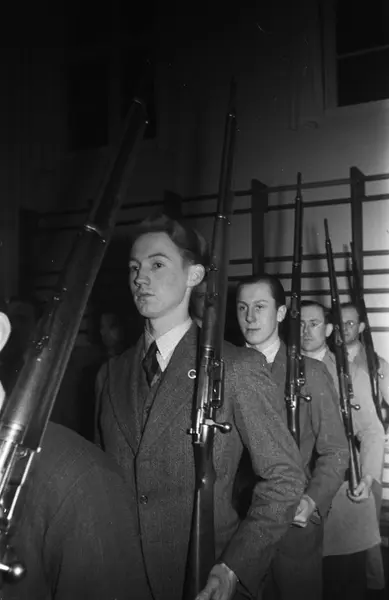 Hegdehaugen skole, interiør, gymnastikksal, menn, studenter, geværer, frivillig militæropplæring