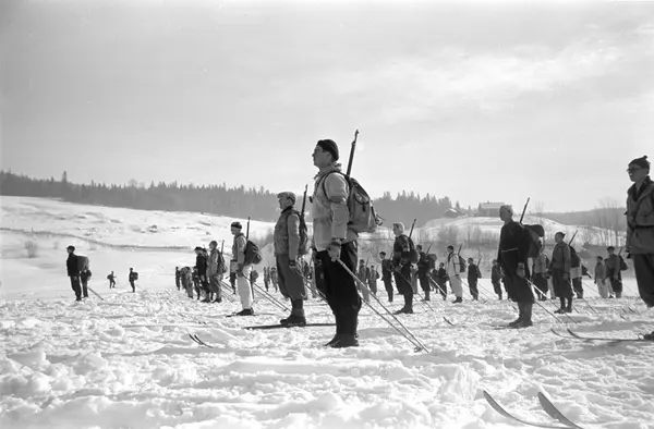 menn, studenter, soldater, oppstilling, ski, geværer, frivillig militæropplæring, gård, kulturlandskap, snø