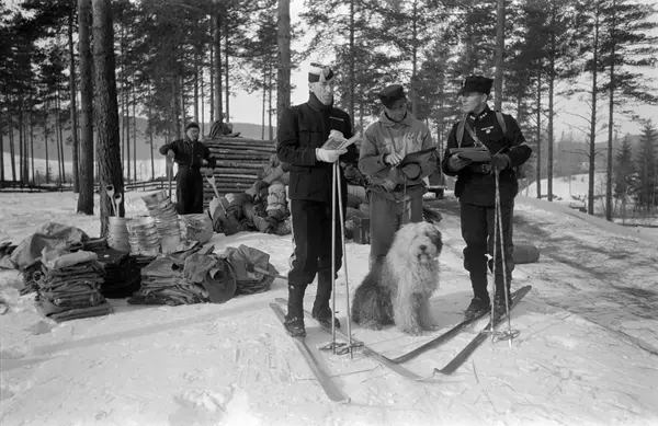 menn, studenter, soldater, offiser, ski, geværer, frivillig militæropplæring, hund