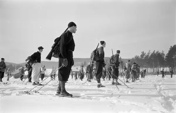 menn, studenter, soldater, oppstilling, ski, geværer, frivillig militæropplæring, gård, kulturlandskap, snø
