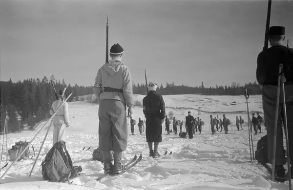 menn, studenter, soldater, oppstilling, ski, geværer, frivillig militæropplæring, kulturlandskap, snø