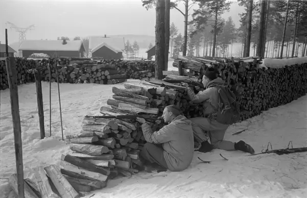 menn, studenter, soldater, ski, geværer, frivillig militæropplæring, vedstabler, gård
