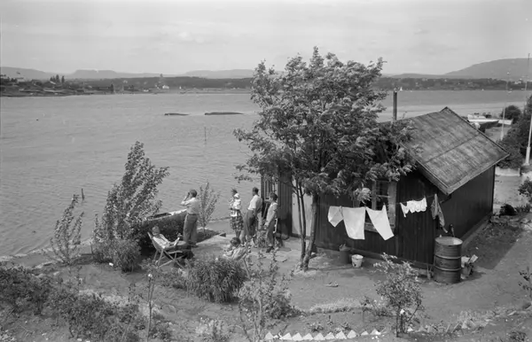 hytte, hage, fluktstoler, menn, kvinner, barn, klestørk, fjord