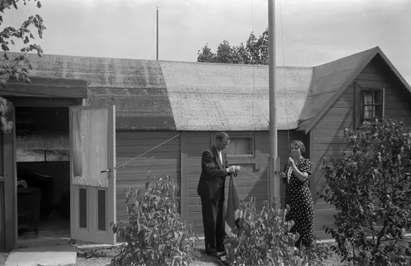 hytte, kvinne, mann, flaggstang, flaggheising, hage