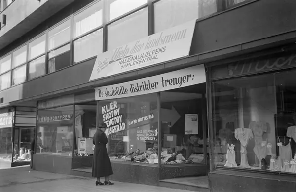 forretningsgård, Nasjonalhjelpens samlesentral, utstillingsvindu, forretninger, kvinne