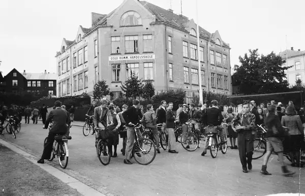 Oslo kommunale handelsskole, gate, gutter, jenter, skoleelever, sykler, villa, bygård