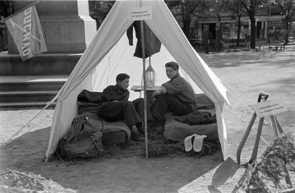Arbeidstjenesten, informasjonsstand, telt, menn, madrasser, ryggsekk