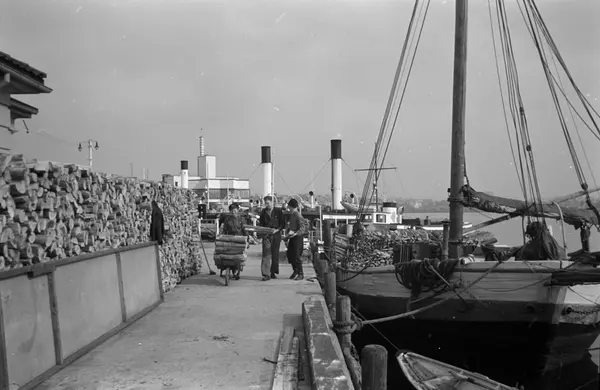 brygge, vedstabler, menn, seilfartøy, dampbåter, Dronningen