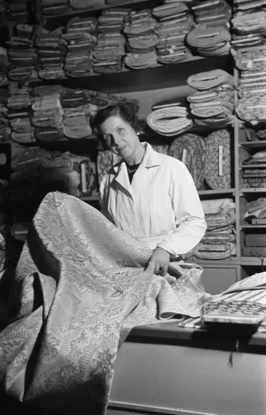 Von der Lippes møbelforretning, interiør, kvinne, innehaver, motstandskvinne, disk, tekstilruller