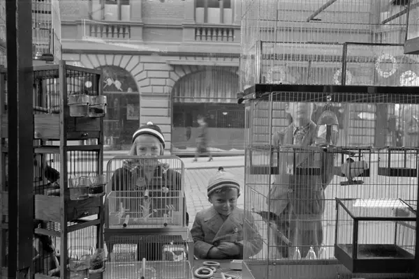 Aquarium dyreforretning, utstillingsvindu, fuglebur, fugler, barn