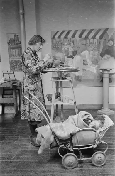 atelier, interiør, kvinne, billedhugger, barnevogn, barn