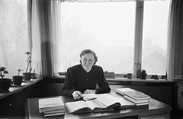 bolig, interiør, stue, kvinne, forfatter, bibliotekar, lege, psykiater, sittende halvfigur ved skrivebord