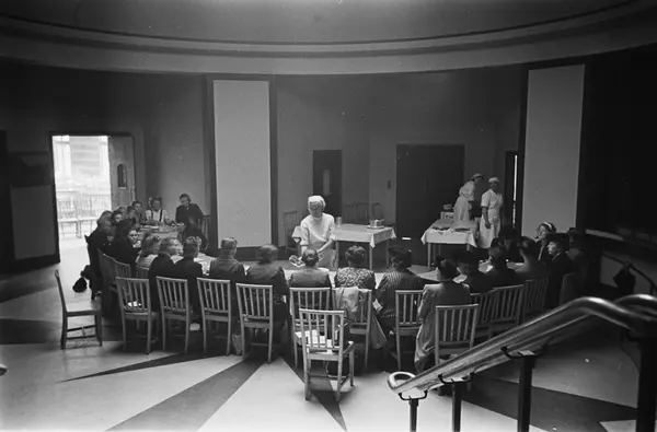 Freia sjokoladefabrikk, interiør, demonstrasjon av matvarer, kvinner, husstellærere, husmødre