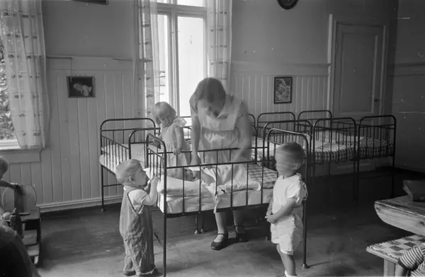 Tøyenkirkens barnekrybbe, interiør, kvinne, barn, senger