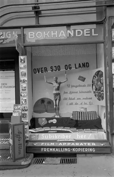 bokhandel, utstillingsvindu, bøker, Gyldendals nye reiseserie Over sjø og land