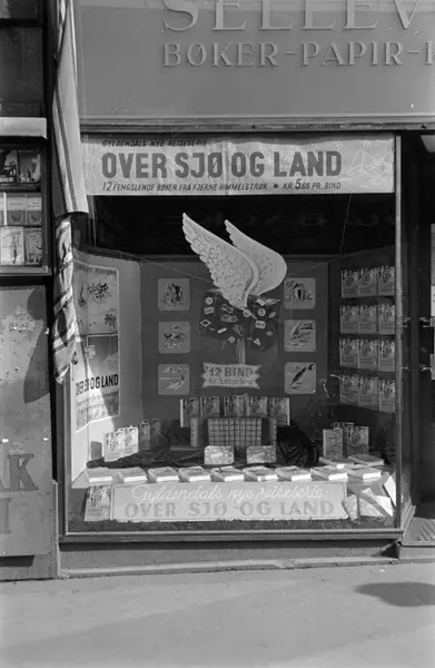 Sellevolds bokhandel, utstillingsvindu, bøker, Gyldendals nye reiseserie Over sjø og land