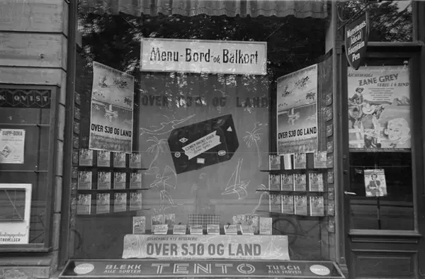 Erik Qvist bokhandel, utstillingsvindu, bøker, Gyldendals nye reiseserie Over sjø og land