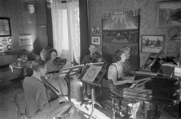 bolig, interiør, menn, kvinner, musikere, familieorkester
