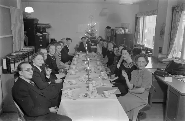 Alle Kvinners Blad, interiør, redaksjonslokale, langbord, julebord, kaffebord, kvinner, menn, juletre