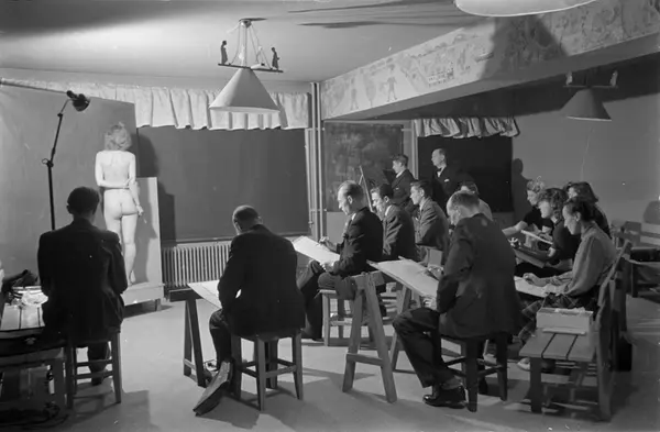 Spanges tegneskole, interiør, tegnekurs, menn, kvinner, tegnere, aktmodell, blendingsgardiner