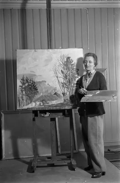kvinne, kunstmaler, stående helfigur, palett, staffeli, maleri