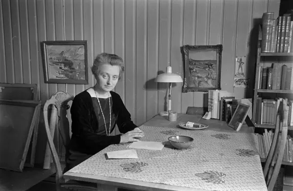 interiør, kvinne, kunstmaler, sittende ved bord, malerier, bokhylle