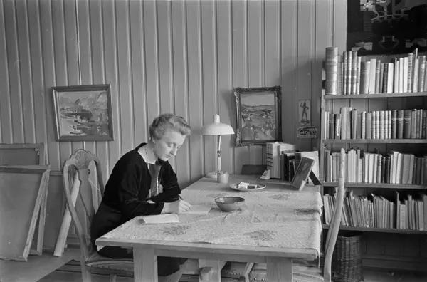 interiør, kvinne, kunstmaler, sittende ved bord, malerier, bokhylle