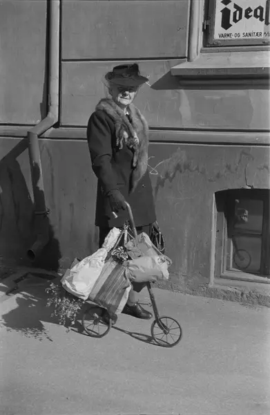 fortau, bygård, kvinne, drakt, pels, hatt, slør, pakketriller