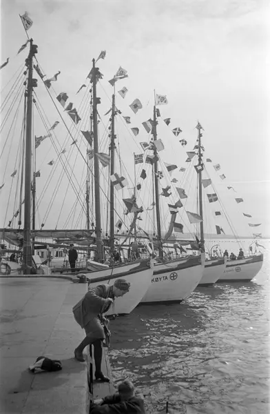 Rådhusbryggene, kvinne, ombordstigning i båt, mann, Colin Archer redningsskøyter, signalflagg