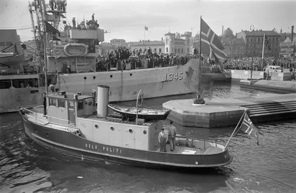 Rådhusbryggene, honnørbrygge, marinefartøy, mennesker, flagg, politibåt, bygårder, Vestbanestasjonen