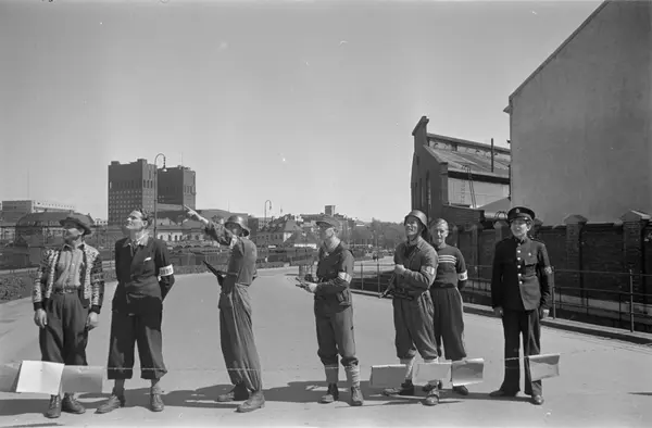 vei, menn, soldater, stengun, politi, veisperring ved kronprins Olavs hjemkomst, Akers mek. Verksted, Vestbanestasjonen, Rådhuset