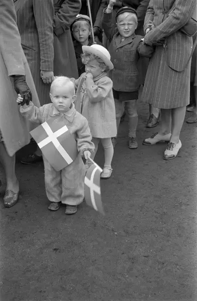Frogner stadion, arrangement for barn etter folketoget, gutter, danske flagg