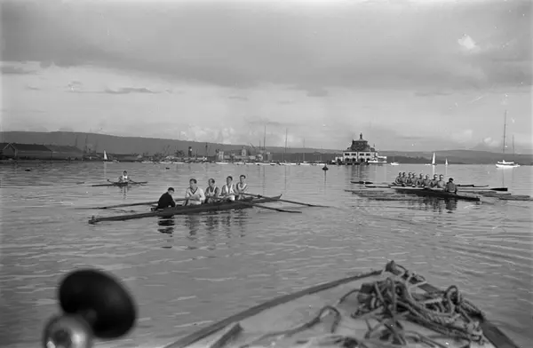 fjord, robåter, menn, roere, Kongen, Christiania Roklub, klubbhus