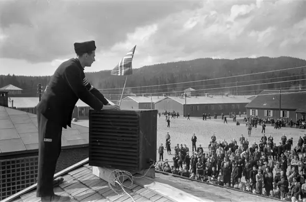 Grini fangeleir, tak, mann, fange 10260, flagg, høyttaler, fanger
